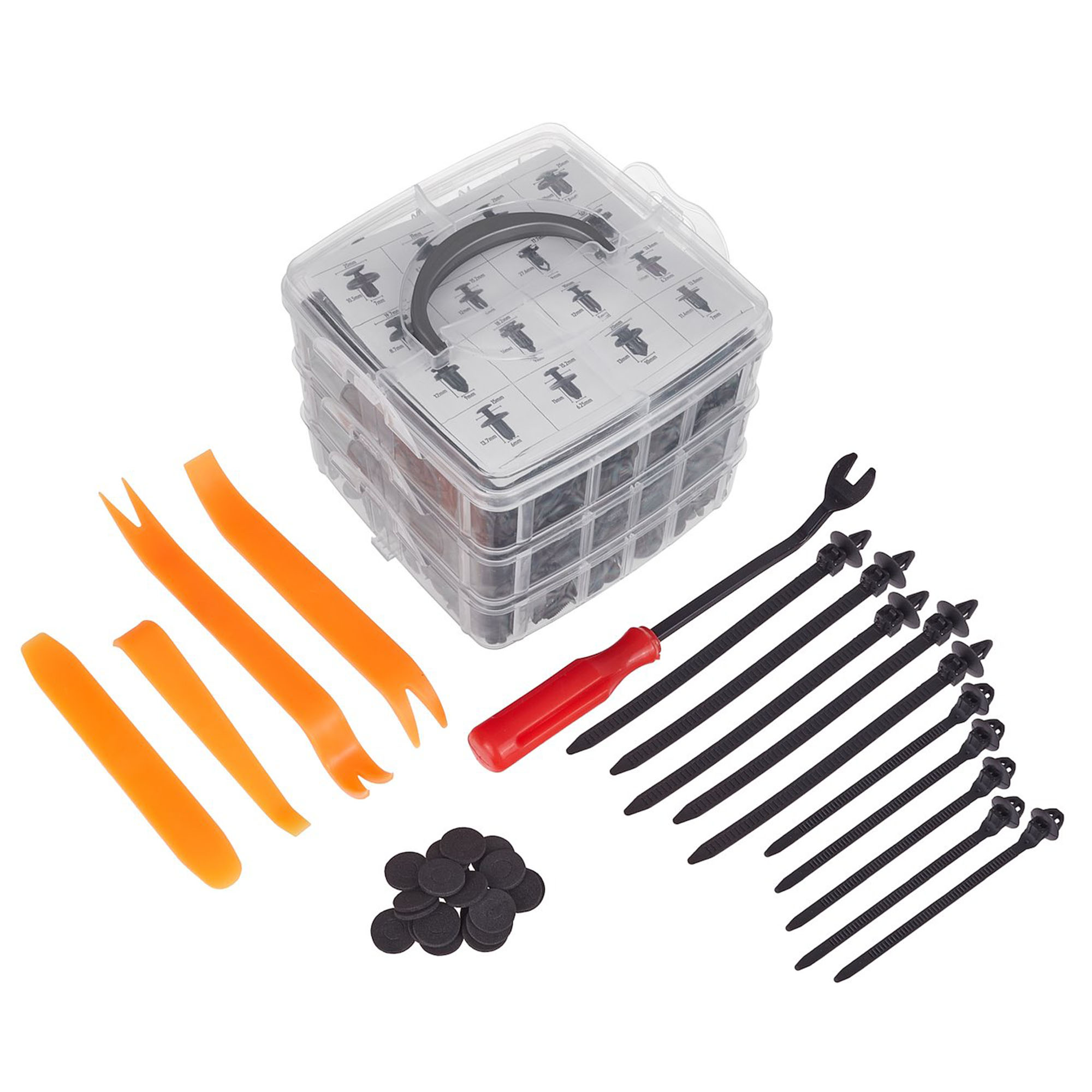 Korikiinnikesarja sisältää 16 erilaista kiinniketyyppiä, jotka sopivat moniin automalleihin, joten voit helposti korjata verhoiluja, ovilistoja ja muita sisä- ja ulkopaneeleja. Lisäksi mukana on 10 nippusidettä kahdessa eri koossa, jotka helpottavat kaapeleiden ja johtojen järjestämistä, parantaen sisustan siisteyttä ja toimivuutta. Neljä erikoisvalmisteista paneelinirrotustyökalua mahdollistavat osien turvallisen ja vahingoittamattoman purkamisen. Kiinnikkeiden irrotustyökalu nopeuttaa ja helpottaa työskentelyä ja 20 aluslevyä tarjoavat lisätukea sitä tarvitseviin kohtiin. Osat on valmistettu korkealaatuisesta nailonista, joka takaa kestävyyden ja säänkestävyyden. Tämä on korvaamaton sarja kaikille, jotka arvostavat luotettavuutta ja ammattimaisuutta auton korjauksessa!