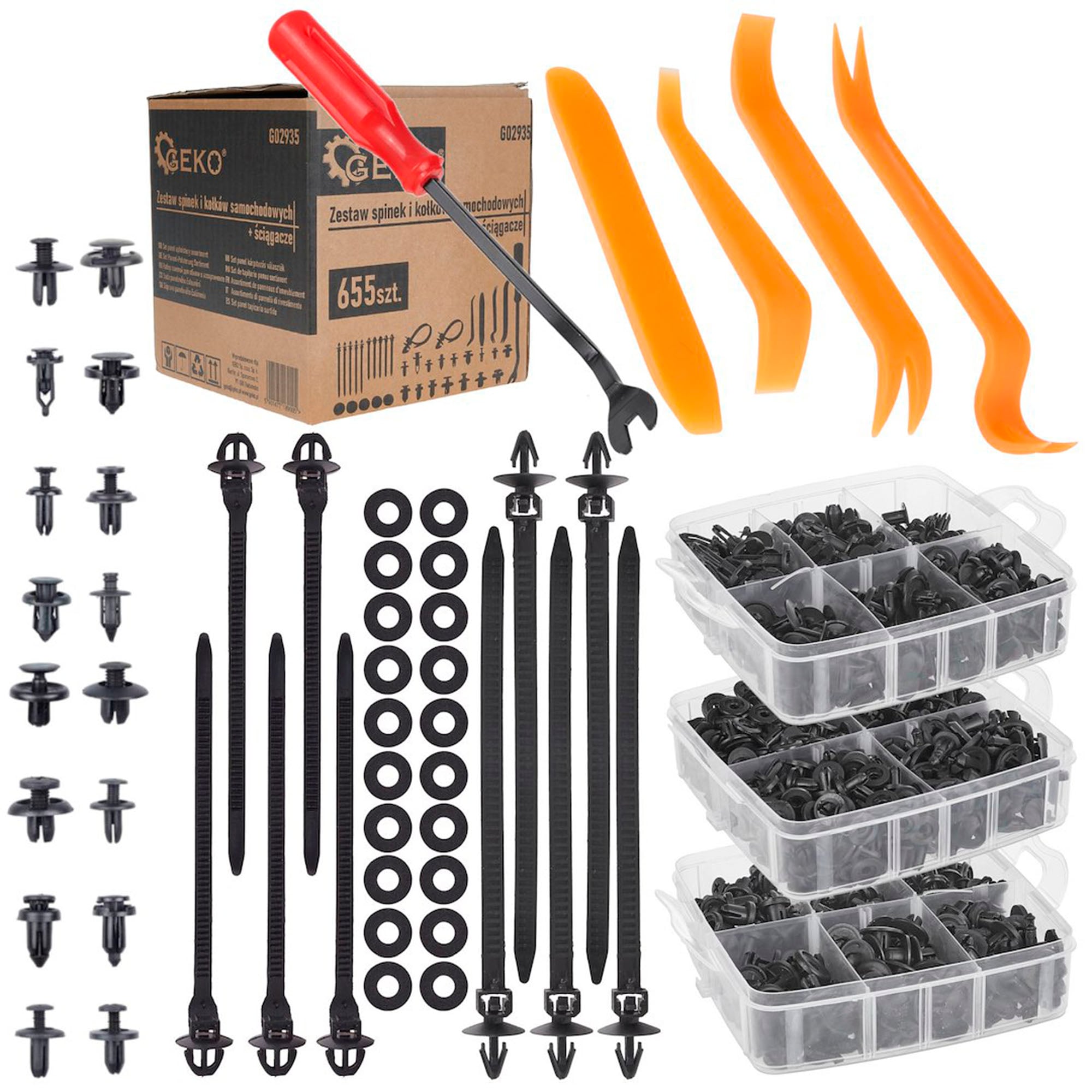 655-osainen auton verhoilukiinnikesarja, sekä irrotustyökalut auton sisäverhoiluun, ovipaneeleihin sekä muihin sisä- ja ulkopuolen osiin.