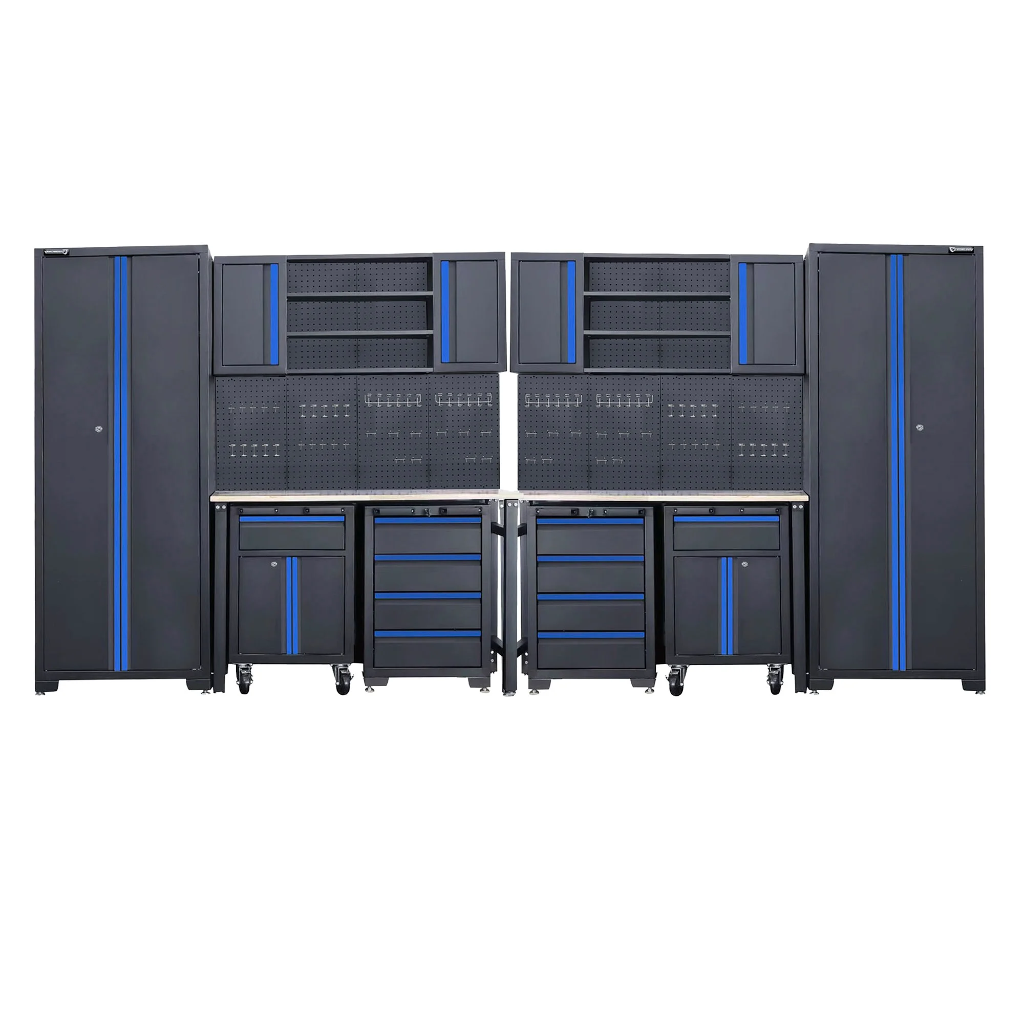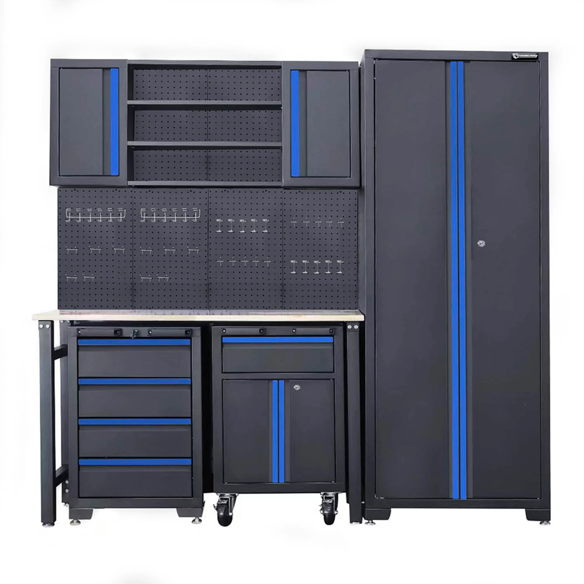 Korkealaatuinen autotallin ja korjaamon iso työpiste kaapistoilla ja työpöydällä, jossa pyötätila työskentelylle sekä työkaluseinä. Monipuolinen ja kestävä työpiste tarjoaa säädettävät hyllyt sekä tilavan puisen työtason. Työpisteen ruosteenkestävä teräsrakenne ja säädettävät jalat takaavat vakauden ja pitkän käyttöiän.