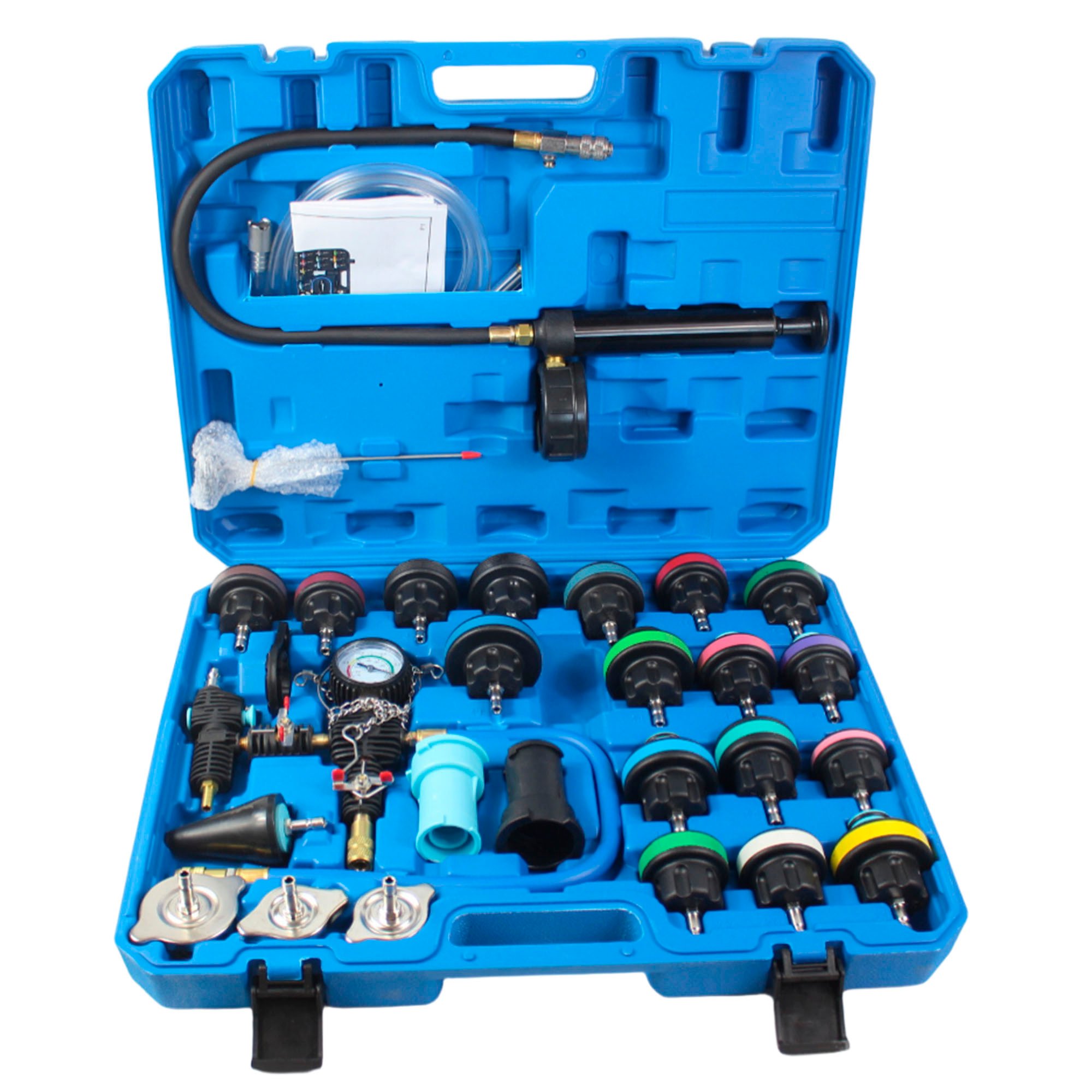 • 1 kpl sininen ja 1 kpl musta jäähdyttimen korkin testiadapteri testaamaan alkuperäisen jäähdyttimen korkin vuotoa