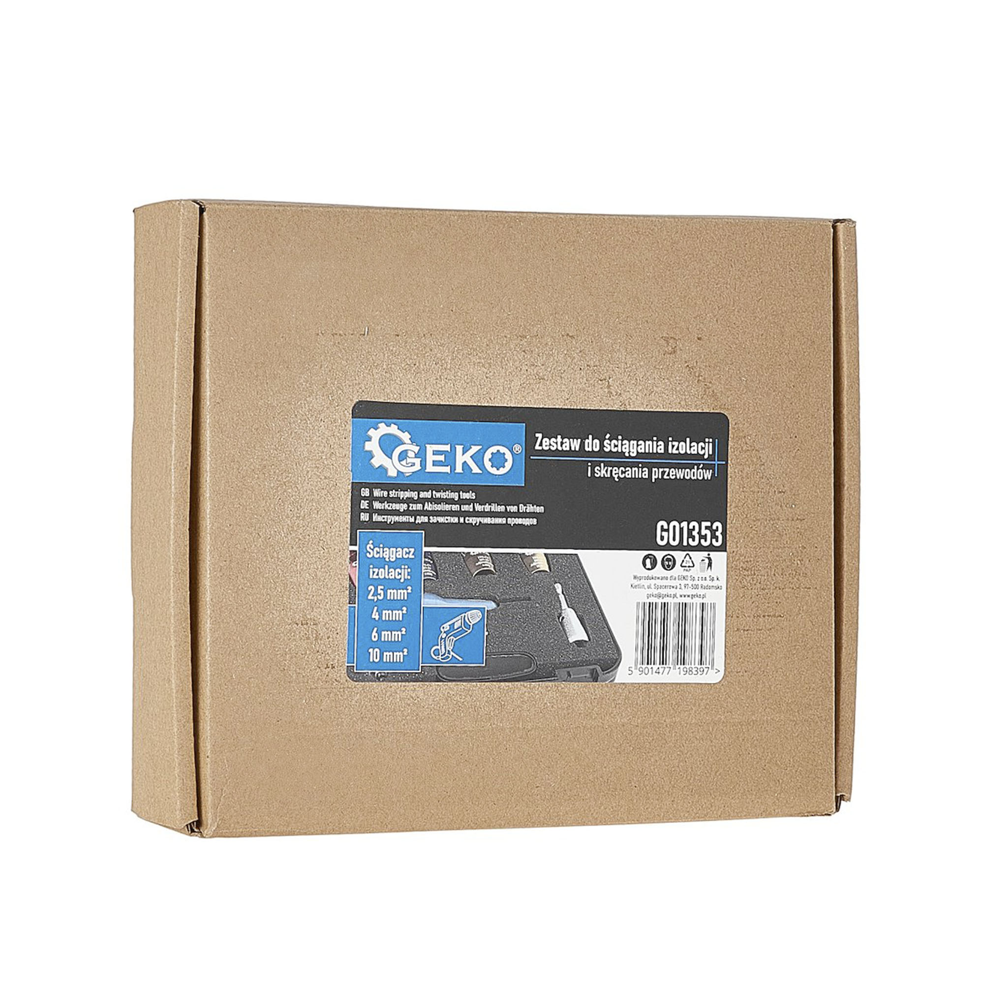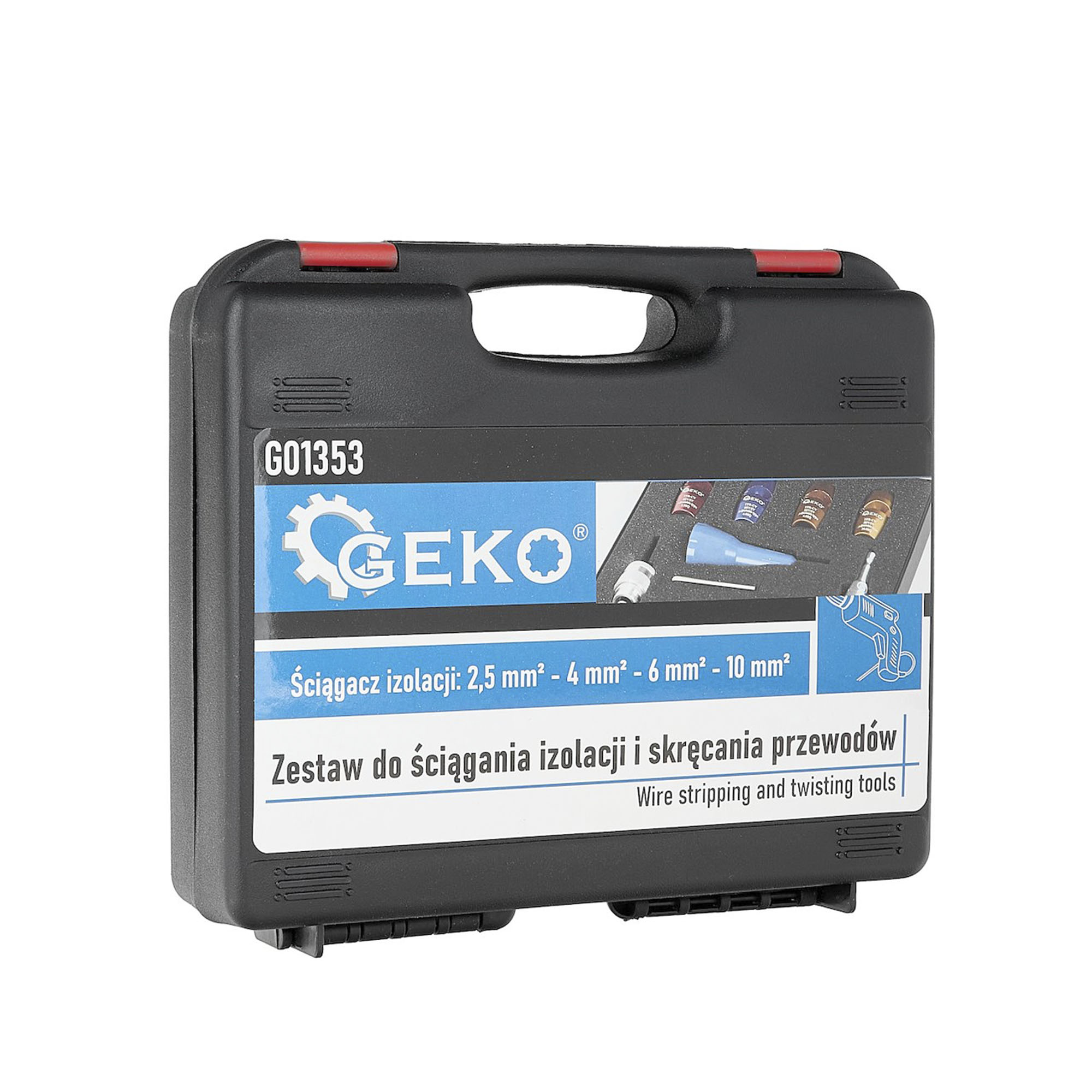 Geko kaapelin kuorinta- ja kiertosarja on suunniteltu käytettäväksi yhdessö ruuvinvääntimien ja porakoneiden kanssa. Mahdollistaa nopean ja tarkan johtojen kuorinnan ja kiertämisen ilman johtimen vaurioitumista. Erinomainen ratkaisu sähköasentajille ja tee-se-itse -käyttäjille muun muassa huolto- ja asennustöihin, sekä verstaille. Pakkaus sisältää 4 värikoodattua johdonkuorintapäätä eri koossa (2,5 mm² punainen, 4,0 mm² sininen, 6,0 mm² kulta 10,0 mm² kulta). Työkalu on pakattu kestävään muovisalkkuun, jossa osat on helppo pitää järjestyksessä säiltyksen ja kuljetuksen aikana.