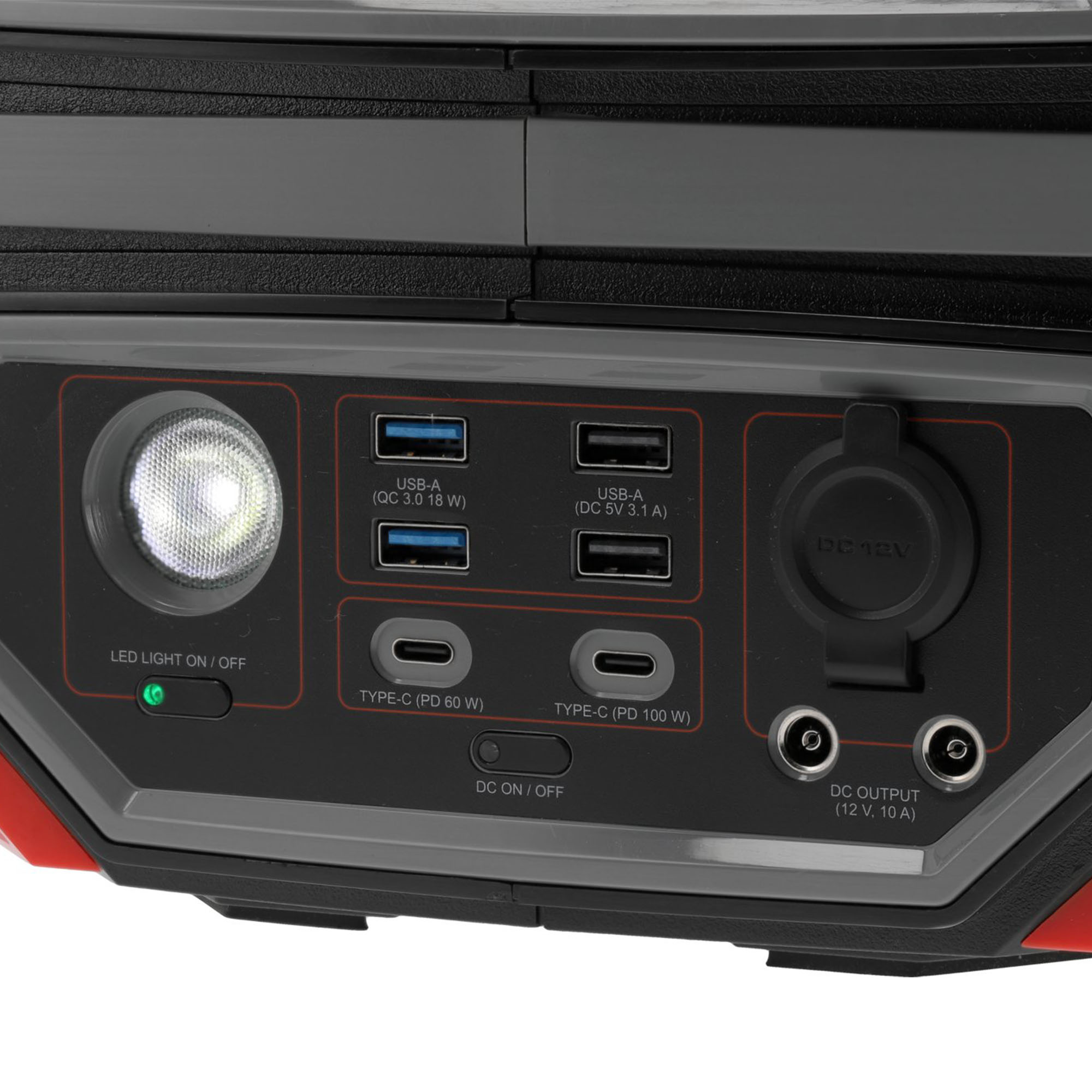 - Lataus: Verkkovirta (max 180 W), auton 12 V liitäntä (tupakansytytin), aurinkopaneeli